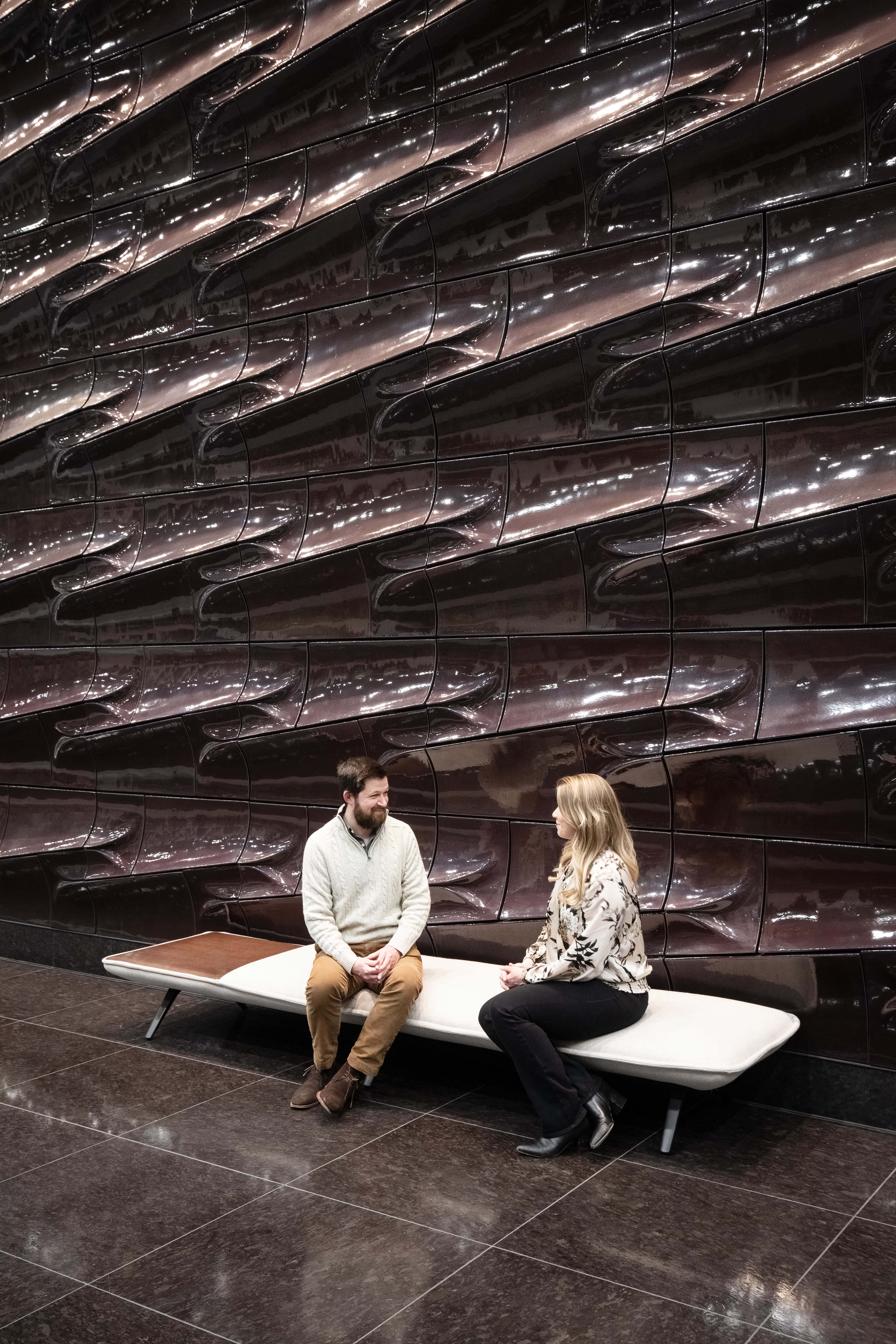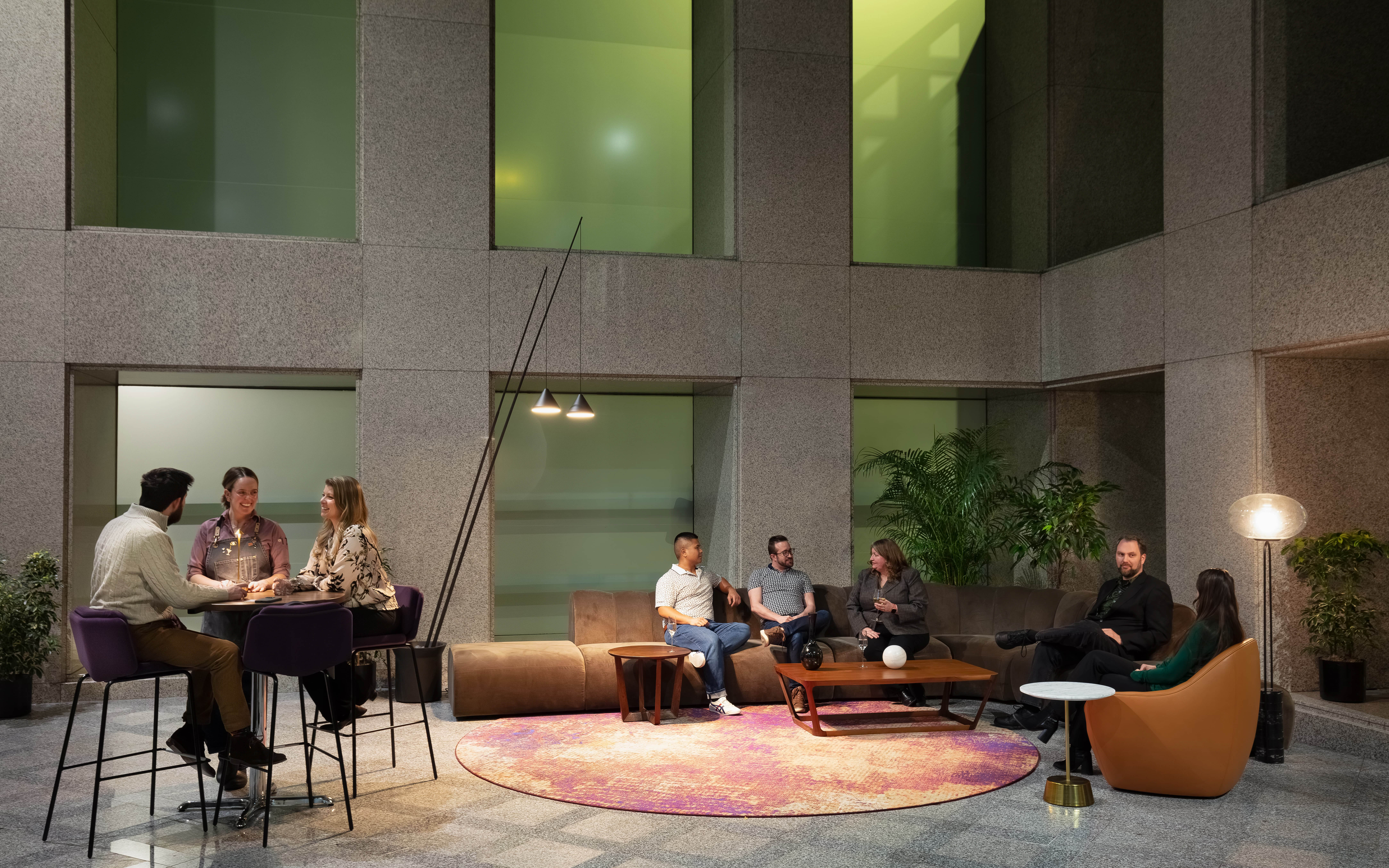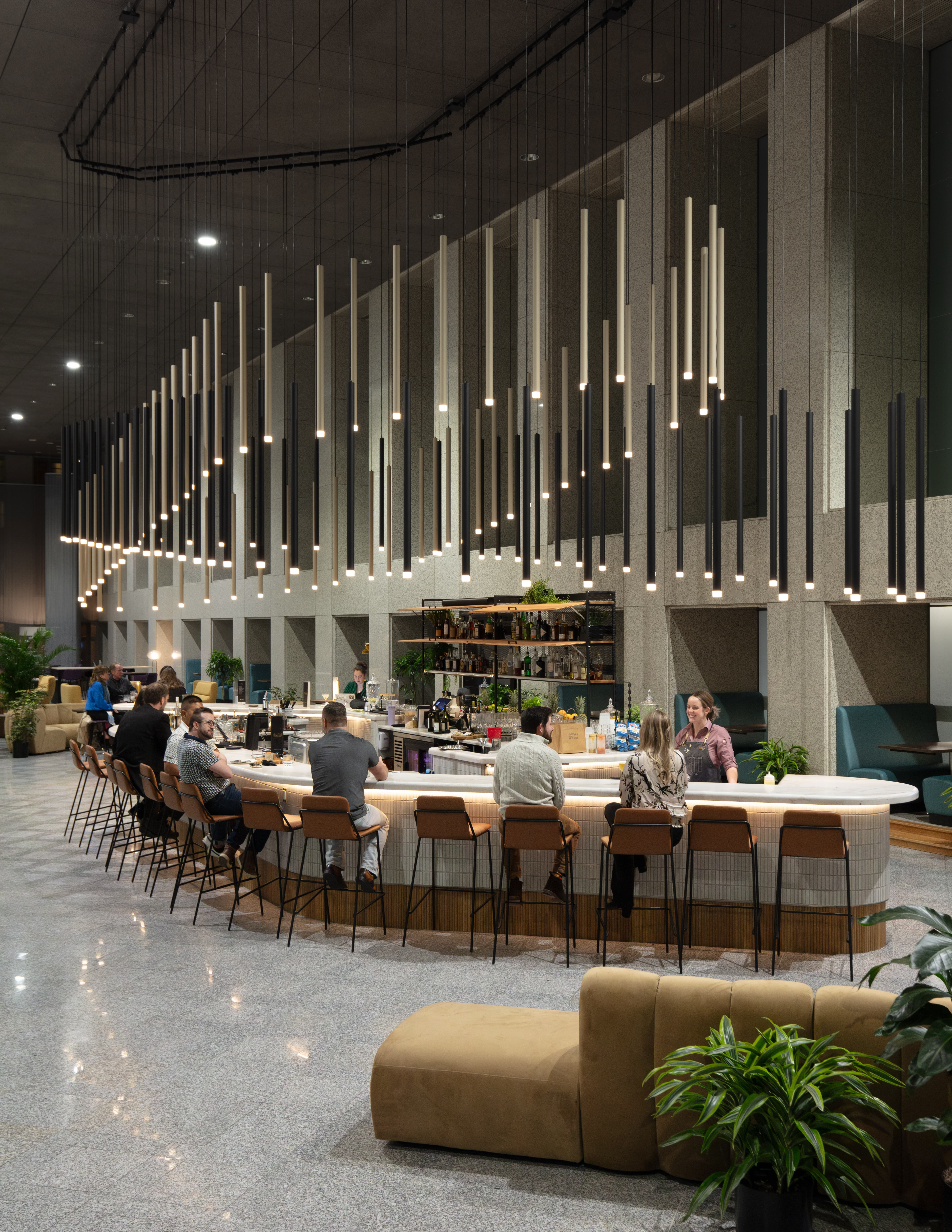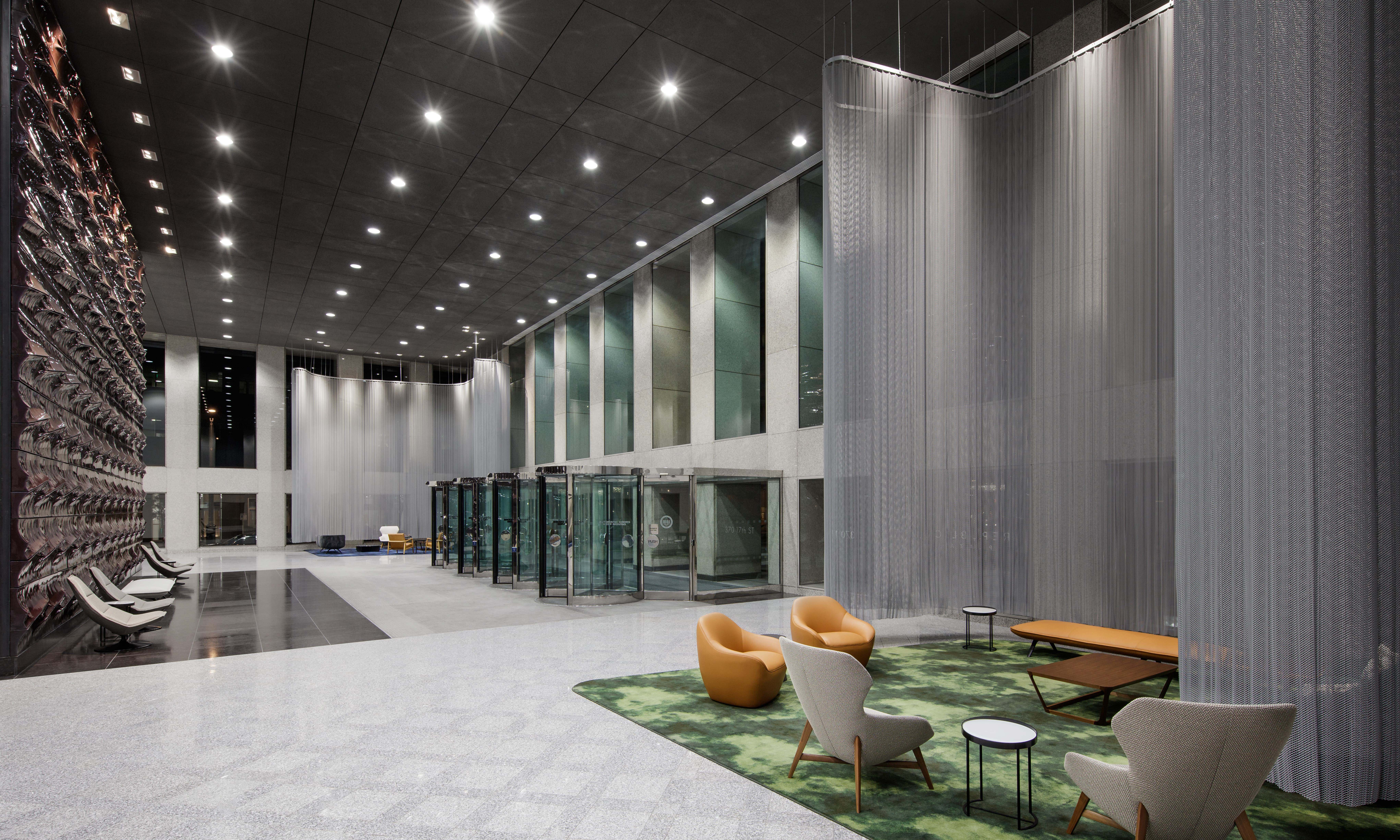 A comprehensive repositioning of Denver’s tallest high-rise, this project reimagines its 56-story presence through a refined, hospitality-driven lobby. A custom curved marble bar anchors “Done Deal,” paired with a dramatic installation of suspended rods that echo its form. Original 1980s granite is layered with jewel-toned seating, lush greenery, and a sculptural terra cotta wall—transforming the space into an inviting, high-end destination in the city’s core.